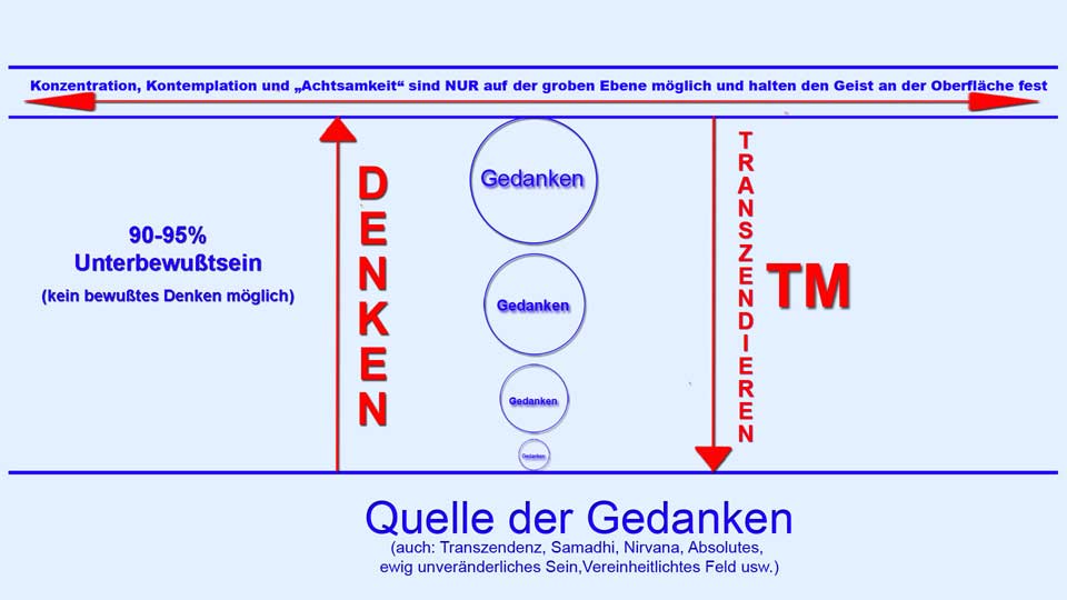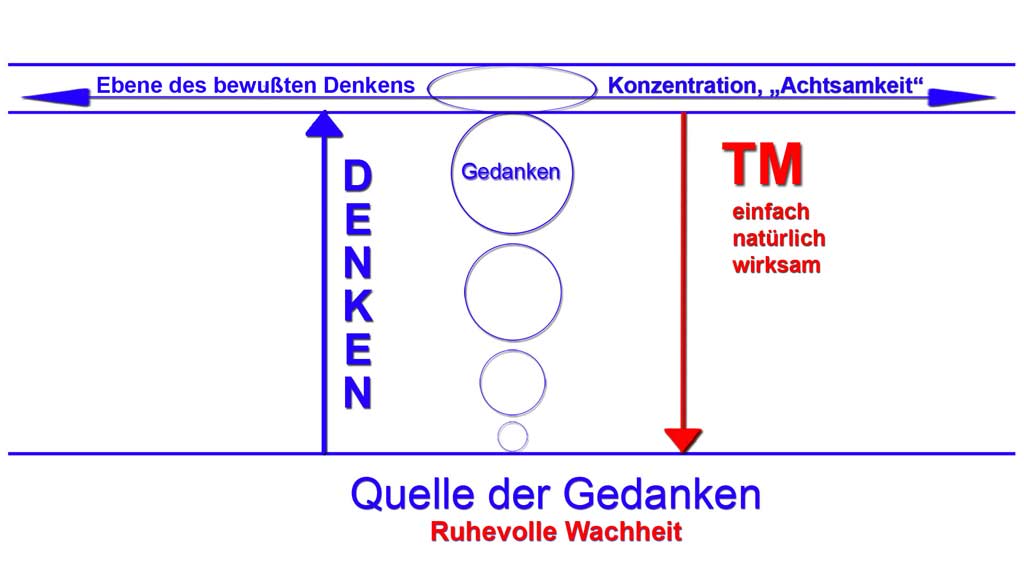 Transzendentale Meditation ist eine viele Tausend Jahre alte Methode, welche den Geist auf sehr einfache und natürliche Weise zur Ruhe bringt. Weil Geist und Körper so eng zusammenhängen, kommt auch der Körper zur Ruhe, und zwar weit tiefer als im Tiefschlaf, während der Geist völlig wach bleibt. In dieser tiefen Ruhe lösen sich Stresse und Verspannungen, die der Schlaf alleine heute nicht lösen kann. Infolge der mit dem modernen Leben verbundenen Überbelastung sammeln sich diese Stresse und Verspannungen über Jahrzehnte hinweg im Nervensystem an und beeinträchtigen dessen Funktion mehr und mehr. Dies führt zu mannigfaltigen psychosomatischen Störungen und ernsthaften Erkrankungen. Um Stresse zu lösen braucht man Ruhe, um tiefverwurzelte Stresse zu lösen, braucht man tiefere Ruhe. Die TM ermöglicht diese äußerst tiefe Ruhe und verbessert darum ganz natürlich die körperliche, geistige und seelische Gesundheit. Die TM hat sich als wirksames Instrument zur Prävention und Heilung von Ängsten, Depressionen, Burnout, Schlafstörungen, Bluthochdruck, PTBS, Süchten, usw. erwiesen. Die Gesundheitskosten sanken um über 50%. Mit über 600 Arbeiten, darunter 364 Peer Review-Studien, durchgeführt an 250 unabhängigen Universitäten und anderen wissenschaftlichen Instituten in 33 Ländern, ist TM die wissenschaftlich am umfassendsten dokumentierte Meditationstechnik. Veröffentlicht in über 100 weltweit führenden wissenschaftlichen Fachzeitschriften, bestätigen die Studien den Nutzen der TM für jeden Lebensbereich. Wissenschaftliche Forschung über TM #1 WICHTIG: Alle Methoden, welche auf Konzentration, Kontemplation, Suggestion oder "Achtsamkeit" beruhen, funktionieren nur an der groben Oberfläche (5-10%) des bewußten Denkens. (Man kann sich nicht auf etwas konzentrieren, das im Bereich des Unbewußten (90-95%) liegt. Darum halten alle diese Methoden den Geist an der Oberfläche fest. Man kann aber nicht wirklich in die Tiefe kommen, wenn man gleichzeitig den Geist an der Oberfläche festhält. Darum werden solche Methoden oft als mühsam und anstrengend empfunden. TM im Vergleich zu anderen Meditationstetchniken Unsere aktuellen Info-Termine finden Sie stets hier: